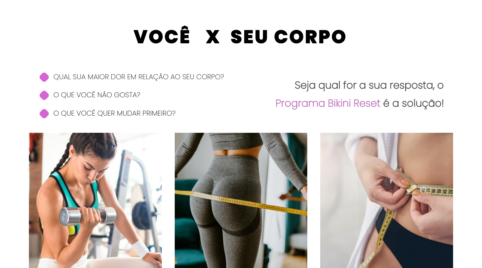 Com o Bikini Reset, transforme seu corpo e resgate sua autoestima. Aprenda a adquirir hábitos saudáveis e emagrecer de maneira eficaz, com um acompanhamento personalizado de 8 semanas. Participe dos encontros semanais e receba orientações especializadas para alcançar seus objetivos.